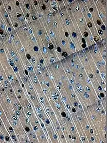 La disposition des tissus, la forme et la taille des cellules, est appelée plan ou rayon ligneux. Celui-ci est caractéristique de chaque essence. Par exemple, il donne ce qu'on appelle « la maillure », qui est l'aspect de la coupe radiale du bois (coupe longitudinale dans le sens du rayon de l'arbre, les rayons ligneux étant observables sous forme de bandes, parfois décoratives). Cette maillure est caractéristique chez le chêne, le hêtre, le platane, le niangon et l'acajou[9]. Les cellules et les fibres sont orientées dans le sens axial, qui détermine le « fil du bois »,