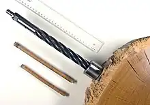 - Densité : la densité du bois est généralement inférieure à 1 (le bois flotte) en raison des vides dans sa structure. Cette densité varie fortement selon un certain nombre de paramètres : l'essence, son degré d'humidité, la situation géographique et son climat, la situation du prélèvement dans l'arbre. On exprime cette densité normalement pour un taux d'humidité égal à 15 % (la moyenne est entre l'état anhydre et l'état de saturation)[13]. La densité à 15 % se situe généralement entre 0,5 et 0,7, mais peut varier considérablement, de 0,1 pour le balsa, 0,4 pour les bois légers (sapin, épicéa, peuplier), 0,8 à 1 pour les bois durs (if, teck, olivier), 1,0-1,15 pour l'ébène, 1,1-1,2 pour l'azobé et 1,3-1,4 pour le gaïac (bois de fer)[14].