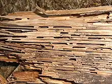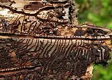 De nombreux insectes lignicoles (diptères, lépidoptères et surtout coléoptères) peuvent être xylophages et saproxylophages : ils consomment le bois à l'état adulte ou le plus souvent à l'état larvaire. Chez les espèces endoxyles, les femelles pondent sur des bois sains (insecte ravageur primaire)[22] ou altérés (ravageur secondaire)[23] des œufs, anfractuosités de l'écorce du tronc ou des branches donnant naissance à des larves lignivores qui creusent des galeries dont la section et le tracé sont caractéristiques des espèces et permettent souvent de les identifier. Les coléoptères épixyles, « imparfaitement protégés des variations des températures extérieures par l'épaisseur de l'écorce, se localisent, en général, mais en fonction des régions, sur certaines faces du bois, évitant les expositions au soleil ou aux intempéries. Leurs galeries sont souvent larges, serpentant dans l'étroit espace entre l'écorce et l'aubier. La nymphose se fait dans une loge superficielle »[24].