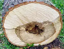 - bois : xylème secondaire lignifié, composé en régions tempérées de cernes. On distingue deux zones :