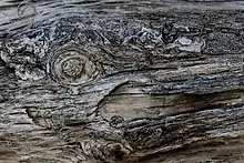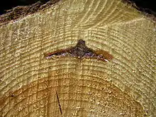 Le bois peut également souffrir de blessures. Les plaies d'élagages regroupent les nœuds formés à la suite de cassures, naturelles ou non, de branches. Les frottures sont produites par l'arrachage de l'écorce. Les corps étrangers provoquent aussi une réaction de l'arbre avec la création d'un bourrelet de recouvrement[16].
