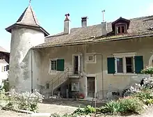 Ce pittoresque et vaste bâtiment, à la fois maison de maîtres et exploitation agricole, comporte un étage sur rez-de-chaussée et est doté, sur sa face nord, deux tourelles cylindriques. Ces tourelles, dont les portes possèdent un encadrement orné d’une gorge dans la tradition de la fin du style gothique, remontent assurément, comme le reste du bâtiment actuel, à la fin du Moyen Âge. Ces deux fortifications d’angle, aux murs minces, n’ont jamais eu de fonction défensive, mais étaient destinées assurément à manifester le statut aristocratique des propriétaires, comme on l’observe entre autres au domaine d’Es-Bons, entre Aubonne et Allaman. La typologie de ces tours de prestige s’est maintenue, notamment à Lausanne, jusqu’à la fin du XVIIIe siècle[7].