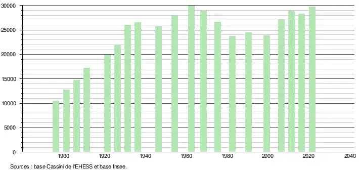 - Par convention dans Wikipédia, le principe a été retenu de n’afficher dans le tableau des recensements et le graphique, pour les populations légales postérieures à 1999, que les populations correspondant à une enquête exhaustive de recensement pour les communes de moins de 10 000 habitants, et que les populations des années 2006, 2011, 2016, etc. pour les communes de plus de 10 000 habitants, ainsi que la dernière population légale publiée par l’Insee pour l'ensemble des communes.