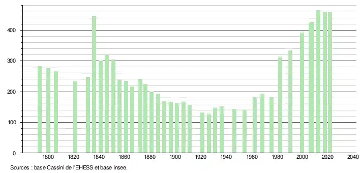 L'évolution du nombre d'habitants est connue à travers les recensements de la population effectués dans la commune depuis 1793. Pour les communes de moins de 10 000 habitants, une enquête de recensement portant sur toute la population est réalisée tous les cinq ans, les populations légales des années intermédiaires étant quant à elles estimées par interpolation ou extrapolation[18]. Pour la commune, le premier recensement exhaustif entrant dans le cadre du nouveau dispositif a été réalisé en 2007[19].