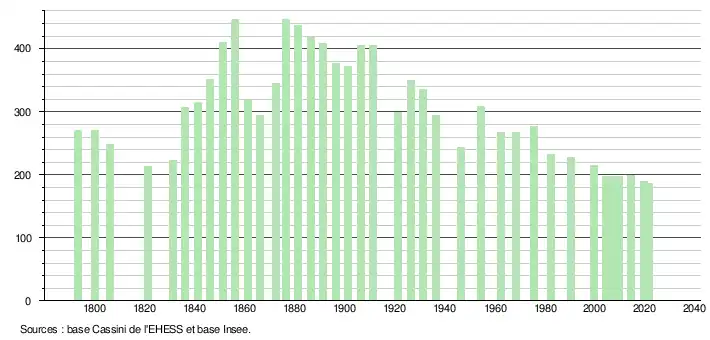 L'évolution du nombre d'habitants est connue à travers les recensements de la population effectués dans la commune depuis 1793. Pour les communes de moins de 10 000 habitants, une enquête de recensement portant sur toute la population est réalisée tous les cinq ans, les populations légales des années intermédiaires étant quant à elles estimées par interpolation ou extrapolation[21]. Pour la commune, le premier recensement exhaustif entrant dans le cadre du nouveau dispositif a été réalisé en 2004[22].