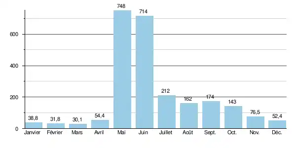 Le débit moyen mensuel observé en février (minimum d'étiage) est de 30,08 m3/s, soit environ 4 % du débit moyen du mois de mai (748 m3/s), ce qui souligne l'amplitude importante des variations saisonnières. Sur la durée d'observation de 37 ans, le débit mensuel minimal a été de 10,2 m3/s (), tandis que le débit mensuel maximal s'élevait à 1 500 m3/s en .