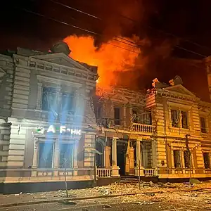 À Kharkiv, trois personnes sont tuées[1] et 13 autres blessées[19] lors de trois vagues d'attaques de missiles[5] ayant endommagé un entrepôt, une installation industrielle, un établissement médical et un dépôt de transport[7].
