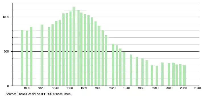 L'évolution du nombre d'habitants est connue à travers les recensements de la population effectués dans la commune depuis 1793. Pour les communes de moins de 10 000 habitants, une enquête de recensement portant sur toute la population est réalisée tous les cinq ans, les populations légales des années intermédiaires étant quant à elles estimées par interpolation ou extrapolation[15]. Pour la commune, le premier recensement exhaustif entrant dans le cadre du nouveau dispositif a été réalisé en 2005[16].