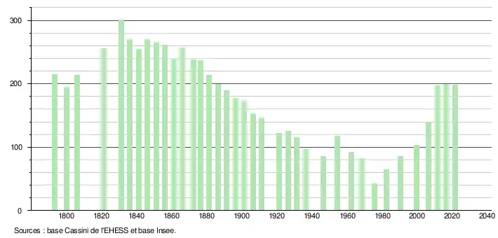 L'évolution du nombre d'habitants est connue à travers les recensements de la population effectués dans la commune depuis 1793. Pour les communes de moins de 10 000 habitants, une enquête de recensement portant sur toute la population est réalisée tous les cinq ans, les populations légales des années intermédiaires étant quant à elles estimées par interpolation ou extrapolation[16]. Pour la commune, le premier recensement exhaustif entrant dans le cadre du nouveau dispositif a été réalisé en 2006[17].