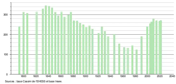 L'évolution du nombre d'habitants est connue à travers les recensements de la population effectués dans la commune depuis 1793. Pour les communes de moins de 10 000 habitants, une enquête de recensement portant sur toute la population est réalisée tous les cinq ans, les populations légales des années intermédiaires étant quant à elles estimées par interpolation ou extrapolation[27]. Pour la commune, le premier recensement exhaustif entrant dans le cadre du nouveau dispositif a été réalisé en 2004[28].