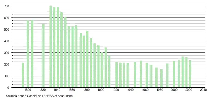 L'évolution du nombre d'habitants est connue à travers les recensements de la population effectués dans la commune depuis 1793. Pour les communes de moins de 10 000 habitants, une enquête de recensement portant sur toute la population est réalisée tous les cinq ans, les populations légales des années intermédiaires étant quant à elles estimées par interpolation ou extrapolation[18]. Pour la commune, le premier recensement exhaustif entrant dans le cadre du nouveau dispositif a été réalisé en 2006[19].