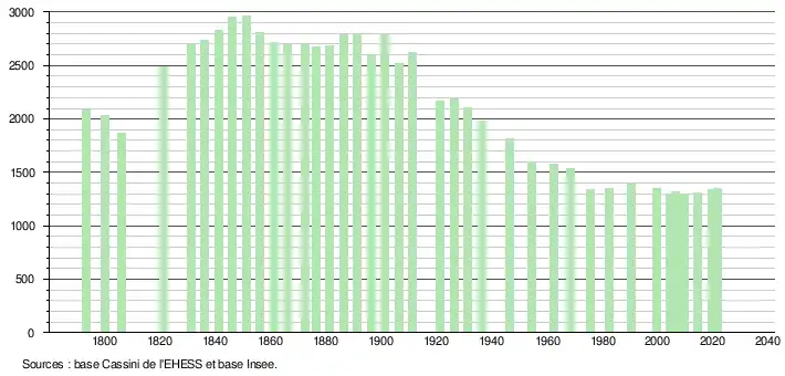 L'évolution du nombre d'habitants est connue à travers les recensements de la population effectués dans la commune depuis 1793. Pour les communes de moins de 10 000 habitants, une enquête de recensement portant sur toute la population est réalisée tous les cinq ans, les populations légales des années intermédiaires étant quant à elles estimées par interpolation ou extrapolation[24]. Pour la commune, le premier recensement exhaustif entrant dans le cadre du nouveau dispositif a été réalisé en 2004[25].