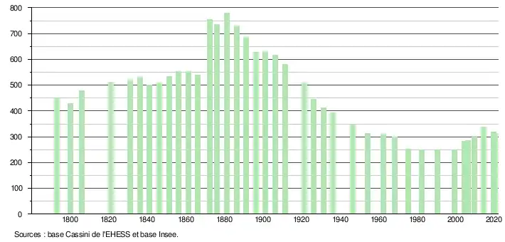 L'évolution du nombre d'habitants est connue à travers les recensements de la population effectués dans la commune depuis 1793. Pour les communes de moins de 10 000 habitants, une enquête de recensement portant sur toute la population est réalisée tous les cinq ans, les populations légales des années intermédiaires étant quant à elles estimées par interpolation ou extrapolation[21]. Pour la commune, le premier recensement exhaustif entrant dans le cadre du nouveau dispositif a été réalisé en 2004[22].