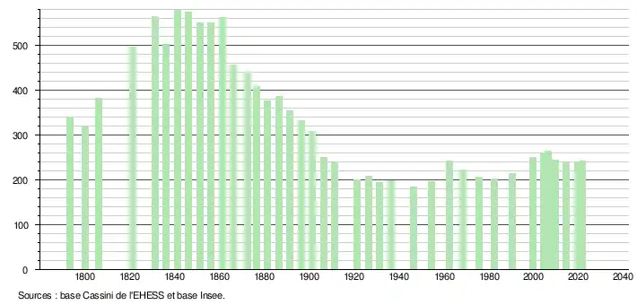 L'évolution du nombre d'habitants est connue à travers les recensements de la population effectués dans la commune depuis 1793. Pour les communes de moins de 10 000 habitants, une enquête de recensement portant sur toute la population est réalisée tous les cinq ans, les populations légales des années intermédiaires étant quant à elles estimées par interpolation ou extrapolation[25]. Pour la commune, le premier recensement exhaustif entrant dans le cadre du nouveau dispositif a été réalisé en 2004[26].