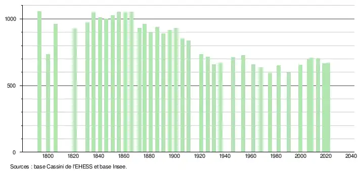 L'évolution du nombre d'habitants est connue à travers les recensements de la population effectués dans la commune depuis 1793. Pour les communes de moins de 10 000 habitants, une enquête de recensement portant sur toute la population est réalisée tous les cinq ans, les populations légales des années intermédiaires étant quant à elles estimées par interpolation ou extrapolation[23]. Pour la commune, le premier recensement exhaustif entrant dans le cadre du nouveau dispositif a été réalisé en 2008[24].