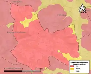Le retrait-gonflement des sols argileux est susceptible d'engendrer des dommages importants aux bâtiments en cas d’alternance de périodes de sécheresse et de pluie. La totalité de la commune est en aléa moyen ou fort (67,4 % au niveau départemental et 48,5 % au niveau national). Sur les 401 bâtiments dénombrés sur la commune en 2019, 401 sont en aléa moyen ou fort, soit 100 %, à comparer aux 84 % au niveau départemental et 54 % au niveau national. Une cartographie de l'exposition du territoire national au retrait gonflement des sols argileux est disponible sur le site du BRGM[21],[Carte 2].
