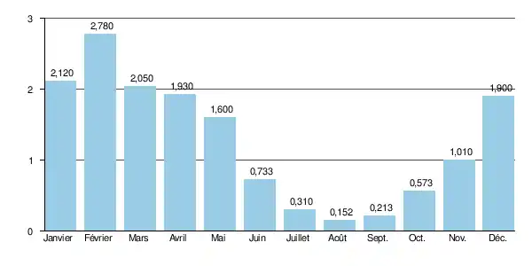 À l'étiage, le VCN3 peut chuter jusque 0,031 m3/s, en cas de période quinquennale sèche, soit 31 litres par seconde, ce qui doit être considéré comme très sévère, le cours d'eau perdant alors plus de 97 % de son débit moyen.