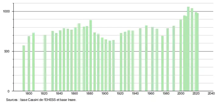 - Population municipale légale en vigueur au 1er janvier 2024, millésimée 2021, définie dans les limites territoriales en vigueur au 1er janvier 2023, date de référence statistique : 1er janvier 2021.