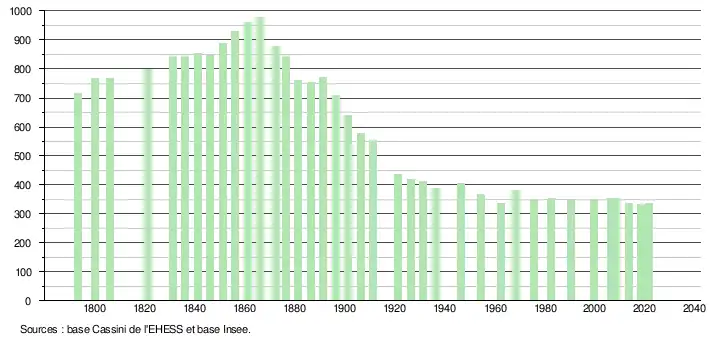 L'évolution du nombre d'habitants est connue à travers les recensements de la population effectués dans la commune depuis 1793. Pour les communes de moins de 10 000 habitants, une enquête de recensement portant sur toute la population est réalisée tous les cinq ans, les populations légales des années intermédiaires étant quant à elles estimées par interpolation ou extrapolation[24]. Pour la commune, le premier recensement exhaustif entrant dans le cadre du nouveau dispositif a été réalisé en 2008[25].