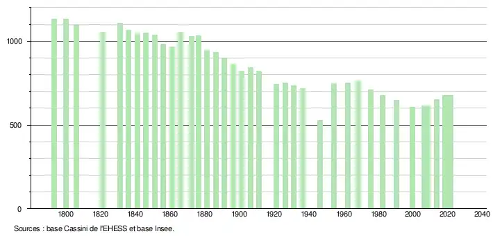 L'évolution du nombre d'habitants est connue à travers les recensements de la population effectués dans la commune depuis 1793. Pour les communes de moins de 10 000 habitants, une enquête de recensement portant sur toute la population est réalisée tous les cinq ans, les populations légales des années intermédiaires étant quant à elles estimées par interpolation ou extrapolation[44]. Pour la commune, le premier recensement exhaustif entrant dans le cadre du nouveau dispositif a été réalisé en 2008[45].