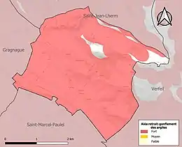 Le retrait-gonflement des sols argileux est susceptible d'engendrer des dommages importants aux bâtiments en cas d’alternance de périodes de sécheresse et de pluie. 95,2 % de la superficie communale est en aléa moyen ou fort (88,8 % au niveau départemental et 48,5 % au niveau national). Sur les 117 bâtiments dénombrés sur la commune en 2019, 113 sont en aléa moyen ou fort, soit 97 %, à comparer aux 98 % au niveau départemental et 54 % au niveau national. Une cartographie de l'exposition du territoire national au retrait gonflement des sols argileux est disponible sur le site du BRGM[25],[Carte 3].