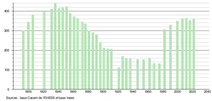 L'évolution du nombre d'habitants est connue à travers les recensements de la population effectués dans la commune depuis 1793. Pour les communes de moins de 10 000 habitants, une enquête de recensement portant sur toute la population est réalisée tous les cinq ans, les populations légales des années intermédiaires étant quant à elles estimées par interpolation ou extrapolation[18]. Pour la commune, le premier recensement exhaustif entrant dans le cadre du nouveau dispositif a été réalisé en 2006[19].