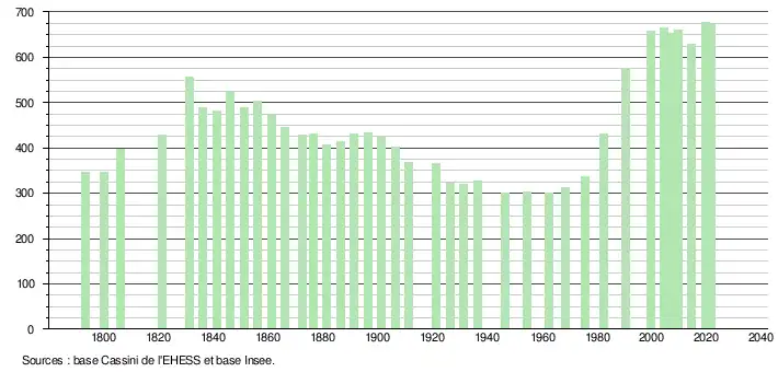 L'évolution du nombre d'habitants est connue à travers les recensements de la population effectués dans la commune depuis 1793. Pour les communes de moins de 10 000 habitants, une enquête de recensement portant sur toute la population est réalisée tous les cinq ans, les populations légales des années intermédiaires étant quant à elles estimées par interpolation ou extrapolation[47]. Pour la commune, le premier recensement exhaustif entrant dans le cadre du nouveau dispositif a été réalisé en 2004[48].