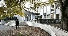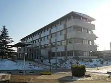 Le bâtiment L et le bâtiment administratif vu du parking.