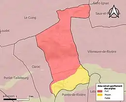Le retrait-gonflement des sols argileux est susceptible d'engendrer des dommages importants aux bâtiments en cas d’alternance de périodes de sécheresse et de pluie. La totalité de la commune est en aléa moyen ou fort (88,8 % au niveau départemental et 48,5 % au niveau national). Sur les 238 bâtiments dénombrés sur la commune en 2019, 238 sont en aléa moyen ou fort, soit 100 %, à comparer aux 98 % au niveau départemental et 54 % au niveau national. Une cartographie de l'exposition du territoire national au retrait gonflement des sols argileux est disponible sur le site du BRGM[40],[Carte 3].