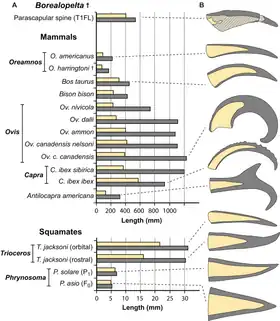 Ils sont disposés en de nombreuses rangées étroitement espacées, situées sur le dos et le flanc de l'animal. Sur chacune des épaules une de ces plaques s'est transformée en une longue épine ou pointe en forme de corne qui mesure plus de 55 centimètres de long[5].