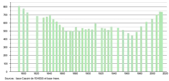 L'évolution du nombre d'habitants est connue à travers les recensements de la population effectués dans la commune depuis 1793. Pour les communes de moins de 10 000 habitants, une enquête de recensement portant sur toute la population est réalisée tous les cinq ans, les populations légales des années intermédiaires étant quant à elles estimées par interpolation ou extrapolation[3]. Pour la commune, le premier recensement exhaustif entrant dans le cadre du nouveau dispositif a été réalisé en 2006[4].