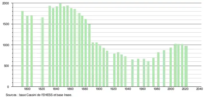 L'évolution du nombre d'habitants est connue à travers les recensements de la population effectués dans la commune depuis 1793. Pour les communes de moins de 10 000 habitants, une enquête de recensement portant sur toute la population est réalisée tous les cinq ans, les populations légales des années intermédiaires étant quant à elles estimées par interpolation ou extrapolation[44]. Pour la commune, le premier recensement exhaustif entrant dans le cadre du nouveau dispositif a été réalisé en 2005[45].