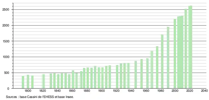 L'évolution du nombre d'habitants est connue à travers les recensements de la population effectués dans la commune depuis 1793. Pour les communes de moins de 10 000 habitants, une enquête de recensement portant sur toute la population est réalisée tous les cinq ans, les populations légales des années intermédiaires étant quant à elles estimées par interpolation ou extrapolation[28]. Pour la commune, le premier recensement exhaustif entrant dans le cadre du nouveau dispositif a été réalisé en 2004[29].