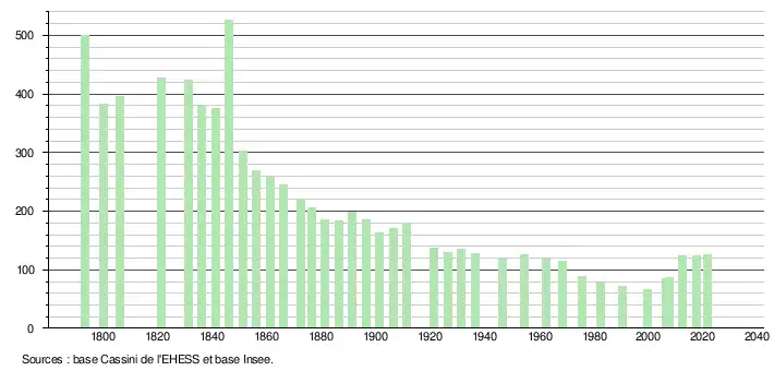 L'évolution du nombre d'habitants est connue à travers les recensements de la population effectués dans la commune depuis 1793. Pour les communes de moins de 10 000 habitants, une enquête de recensement portant sur toute la population est réalisée tous les cinq ans, les populations légales des années intermédiaires étant quant à elles estimées par interpolation ou extrapolation[19]. Pour la commune, le premier recensement exhaustif entrant dans le cadre du nouveau dispositif a été réalisé en 2007[20].