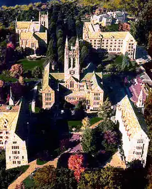 Le campus de 710 000 m2 se trouve à Chestnut Hill, à moins de 10 kilomètres de la ville de Boston et comprend plus de 120 bâtiments. Il est inscrit au Registre national des lieux historiques (en français : le « Registre national des sites historiques ») des États-Unis. C'est un des plus anciens et des plus importants campus de style gothique des États-Unis, inspiré par l'université d'Oxford, son campus a lui-même été une source d'inspiration pour les campus de plusieurs universités américaines, dont Princeton, Yale et Duke.