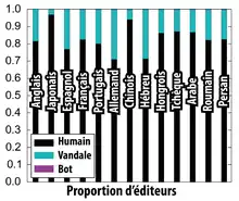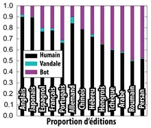 En 2014, les bots (qui ne représentent qu'une fraction négligeable du nombre d'éditeurs) effectuent près de 15 % du nombre de modifications sur Wikipédia[2]. Ce nombre était de plus de 20 % en 2017 sur Wikipédia en français[3].