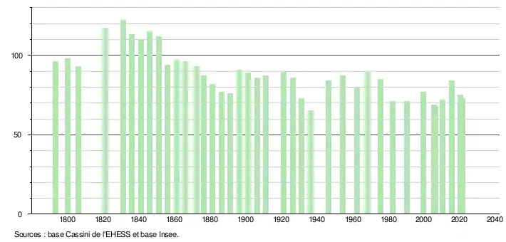 L'évolution du nombre d'habitants est connue à travers les recensements de la population effectués dans la commune depuis 1793. Pour les communes de moins de 10 000 habitants, une enquête de recensement portant sur toute la population est réalisée tous les cinq ans, les populations légales des années intermédiaires étant quant à elles estimées par interpolation ou extrapolation[33]. Pour la commune, le premier recensement exhaustif entrant dans le cadre du nouveau dispositif a été réalisé en 2005[34].