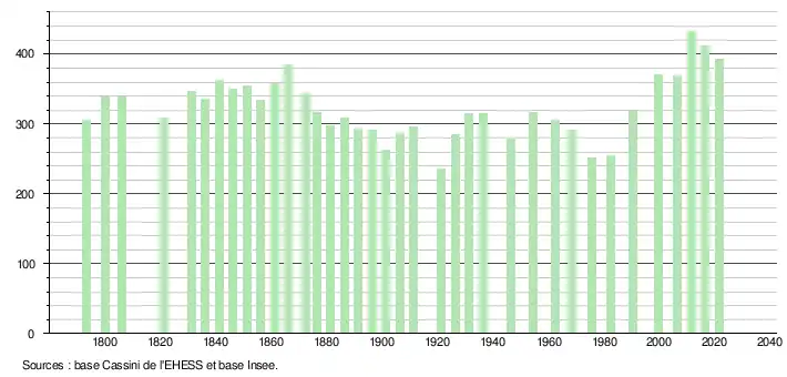 L'évolution du nombre d'habitants est connue à travers les recensements de la population effectués dans la commune depuis 1793. Pour les communes de moins de 10 000 habitants, une enquête de recensement portant sur toute la population est réalisée tous les cinq ans, les populations légales des années intermédiaires étant quant à elles estimées par interpolation ou extrapolation[22]. Pour la commune, le premier recensement exhaustif entrant dans le cadre du nouveau dispositif a été réalisé en 2006[23].