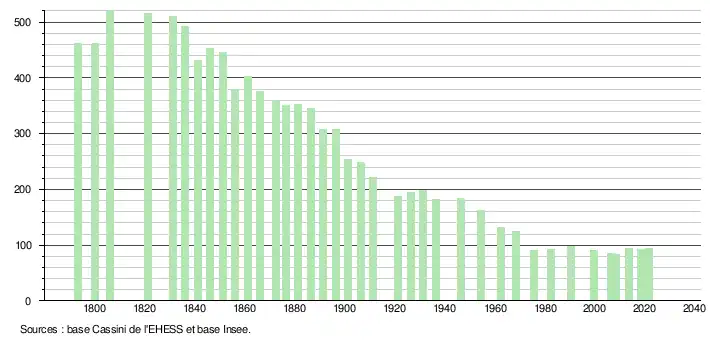 L'évolution du nombre d'habitants est connue à travers les recensements de la population effectués dans la commune depuis 1793. Pour les communes de moins de 10 000 habitants, une enquête de recensement portant sur toute la population est réalisée tous les cinq ans, les populations légales des années intermédiaires étant quant à elles estimées par interpolation ou extrapolation[24]. Pour la commune, le premier recensement exhaustif entrant dans le cadre du nouveau dispositif a été réalisé en 2008[25].
