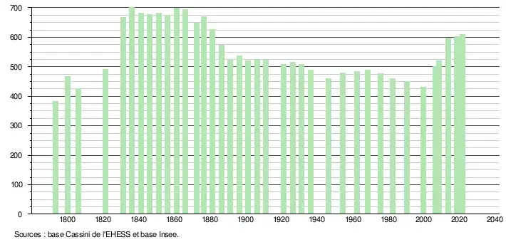 L'évolution du nombre d'habitants est connue à travers les recensements de la population effectués dans la commune depuis 1793. Pour les communes de moins de 10 000 habitants, une enquête de recensement portant sur toute la population est réalisée tous les cinq ans, les populations légales des années intermédiaires étant quant à elles estimées par interpolation ou extrapolation[17]. Pour la commune, le premier recensement exhaustif entrant dans le cadre du nouveau dispositif a été réalisé en 2008[18].