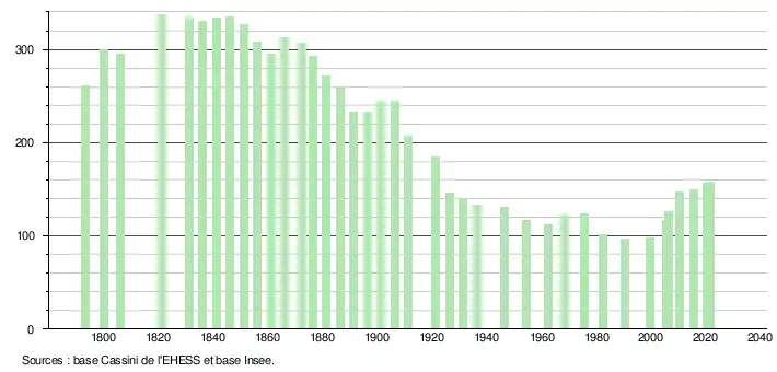 L'évolution du nombre d'habitants est connue à travers les recensements de la population effectués dans la commune depuis 1793. Pour les communes de moins de 10 000 habitants, une enquête de recensement portant sur toute la population est réalisée tous les cinq ans, les populations légales des années intermédiaires étant quant à elles estimées par interpolation ou extrapolation[36]. Pour la commune, le premier recensement exhaustif entrant dans le cadre du nouveau dispositif a été réalisé en 2005[37].