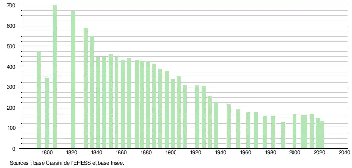 L'évolution du nombre d'habitants est connue à travers les recensements de la population effectués dans la commune depuis 1793. Pour les communes de moins de 10 000 habitants, une enquête de recensement portant sur toute la population est réalisée tous les cinq ans, les populations légales des années intermédiaires étant quant à elles estimées par interpolation ou extrapolation[18]. Pour la commune, le premier recensement exhaustif entrant dans le cadre du nouveau dispositif a été réalisé en 2008[19].