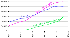 L'agglomération en boulettes ne disparaît cependant pas. Elle s'impose aux États-Unis pour le traitement des concentrés fins du gisement de Mesabi Range, produits pendant la Seconde Guerre mondiale pour remplacer les minerais naturellement riches à plus de 50 % de fer, en voie d'épuisement. L'agglomération en boulettes de ces nouveaux minerais très fins à magnétite (85 % < 44 mm) connait vers 1943 un développement intensif sous l'impulsion de l'université du Minnesota. Le procédé reviendra un peu plus tard en Europe, et plus particulièrement en Suède, comme conditionnement préalable à la fabrication de minerai de fer préréduit[4].