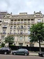 - No 80 : le prince Ali Khan, mort en 1960 dans un accident de voiture boulevard Henri-Sellier à Suresnes, habitait à cette adresse[10], qui devient ensuite celle de l'ambassade de Jordanie en France. Le 23 juillet 1971, après 18 heures 30, l’ambassade est attaquée par un groupe de manifestants pro-palestiniens et plusieurs bouteilles incendiaires sont lancées contre la façade du bâtiment. L’un des manifestants, interpellé peu après, est grièvement blessé par un policier d’un coup de pistolet en plein thorax[11]. En décembre 1970, un groupe d’environ deux cents manifestants avait déjà réussi à pénétrer dans les locaux de l’ambassade, en avait brisé les vitres et aspergé d’acide les meubles et les parquets avant de tenter d’allumer un incendie[12].