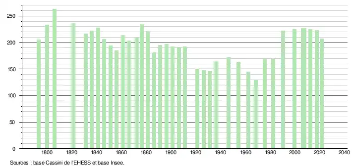 L'évolution du nombre d'habitants est connue à travers les recensements de la population effectués dans la commune depuis 1793. Pour les communes de moins de 10 000 habitants, une enquête de recensement portant sur toute la population est réalisée tous les cinq ans, les populations légales des années intermédiaires étant quant à elles estimées par interpolation ou extrapolation[33]. Pour la commune, le premier recensement exhaustif entrant dans le cadre du nouveau dispositif a été réalisé en 2007[34].
