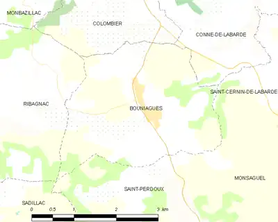 Bouniagues est limitrophe de sept autres communes, dont Sadillac au sud-ouest par une simple quadripoint, et Monsaguel au sud-est sur environ 300 mètres.