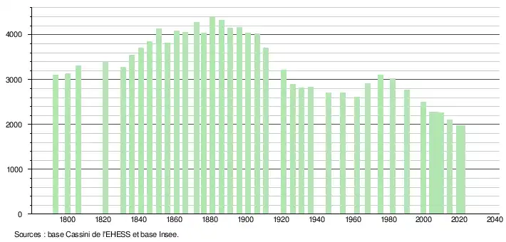 L'évolution du nombre d'habitants est connue à travers les recensements de la population effectués dans la commune depuis 1793. Pour les communes de moins de 10 000 habitants, une enquête de recensement portant sur toute la population est réalisée tous les cinq ans, les populations légales des années intermédiaires étant quant à elles estimées par interpolation ou extrapolation[25]. Pour la commune, le premier recensement exhaustif entrant dans le cadre du nouveau dispositif a été réalisé en 2004[26].