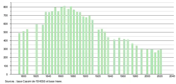 L'évolution du nombre d'habitants est connue à travers les recensements de la population effectués dans la commune depuis 1793. Pour les communes de moins de 10 000 habitants, une enquête de recensement portant sur toute la population est réalisée tous les cinq ans, les populations légales des années intermédiaires étant quant à elles estimées par interpolation ou extrapolation[14]. Pour la commune, le premier recensement exhaustif entrant dans le cadre du nouveau dispositif a été réalisé en 2007[15].