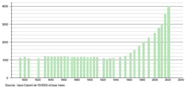 L'évolution du nombre d'habitants est connue à travers les recensements de la population effectués dans la commune depuis 1793. Pour les communes de moins de 10 000 habitants, une enquête de recensement portant sur toute la population est réalisée tous les cinq ans, les populations légales des années intermédiaires étant quant à elles estimées par interpolation ou extrapolation[28]. Pour la commune, le premier recensement exhaustif entrant dans le cadre du nouveau dispositif a été réalisé en 2005[29].