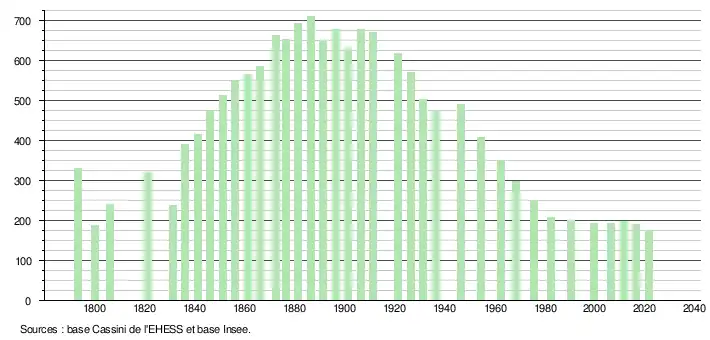 L'évolution du nombre d'habitants est connue à travers les recensements de la population effectués dans la commune depuis 1793. Pour les communes de moins de 10 000 habitants, une enquête de recensement portant sur toute la population est réalisée tous les cinq ans, les populations légales des années intermédiaires étant quant à elles estimées par interpolation ou extrapolation[35]. Pour la commune, le premier recensement exhaustif entrant dans le cadre du nouveau dispositif a été réalisé en 2006[36].